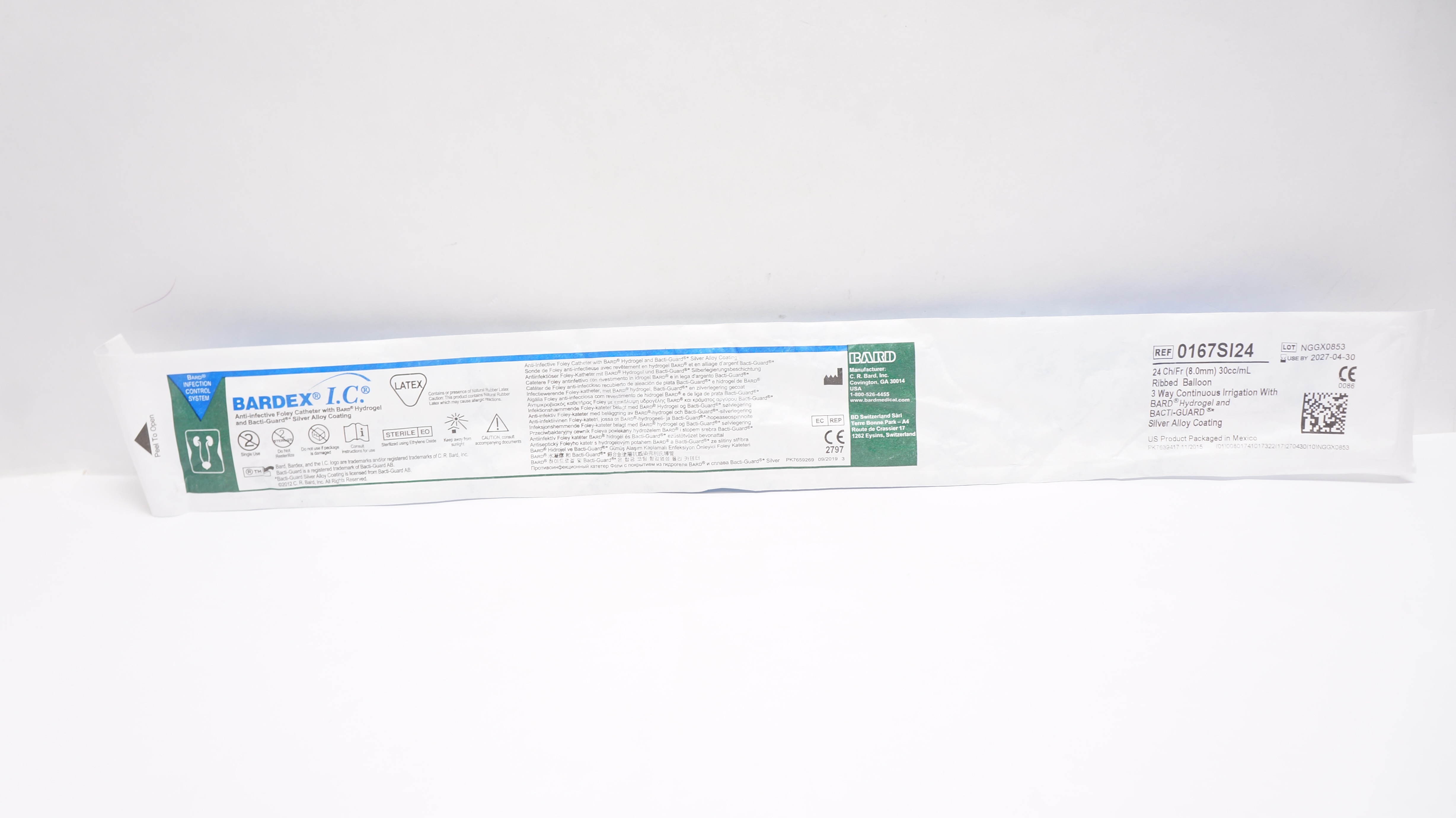 Bard 0167SI24 Bardex I.C. Anti-Infective Foley Catheter 24Ch/Fr 30cc/mL Ribbed Balloon 3Way Continous Irrigation With Bard Hydrogel and Bacti-Guard Silver Alloy Coating