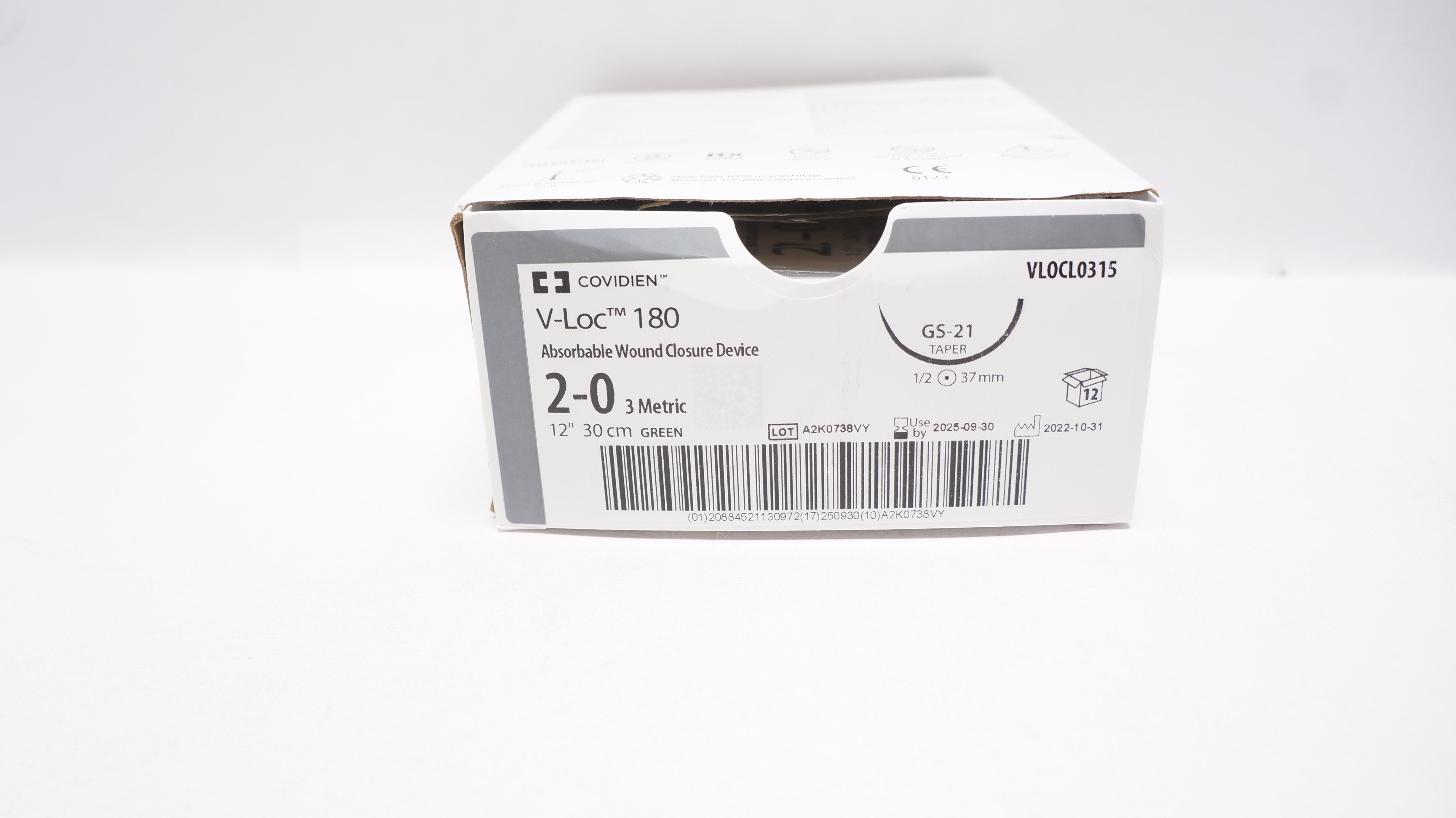 Covidien VLOCL0315 2-0 V-Loc 180 Absorbable Wound Closure Device, GS-21, 1/2 37mm Box of 8 Expiration Date: 2025-09-30